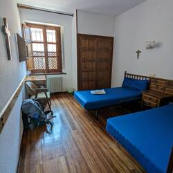 Upon arrival in Sahagún Bruce and I were joined by Nuria (from Barcelona) who we met earlier this week. She is also quite ill so we swapped stories on that front over a cool soda in the shade as we waited for the Albergue Santa Cruz to open. I chose this spot because the guidebook promised it would have private rooms for 20€ . It does! I am pleased to have my own space (and bathroom). It seems more conducive to rest.