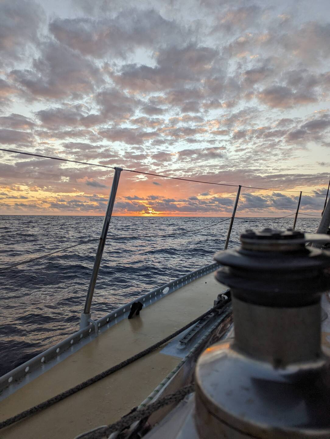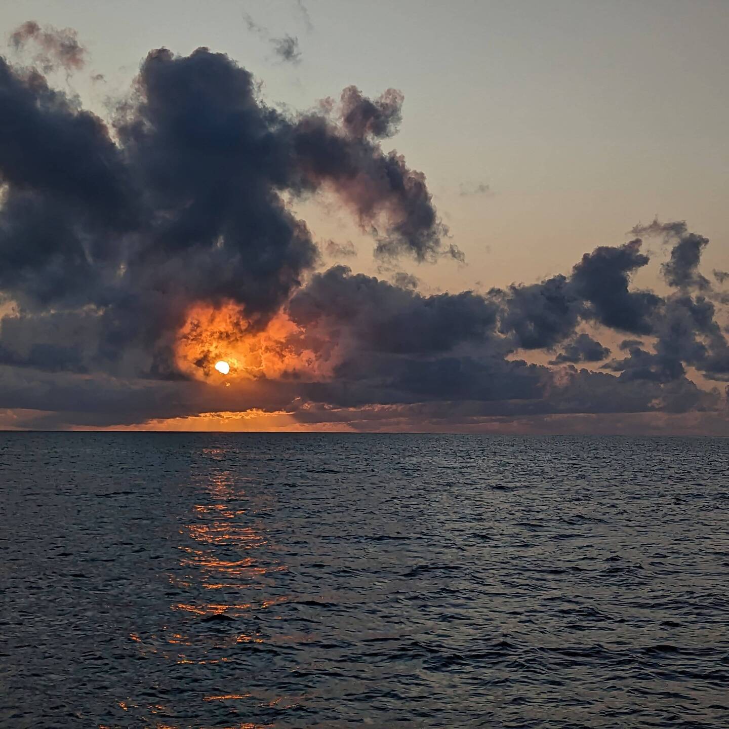 To the sea! We woke to a brilliant moon, did some prep, and weighed anchor. Heading 300 degrees, calm water, magnificent sunrise, 1st coffee done and we are off!
