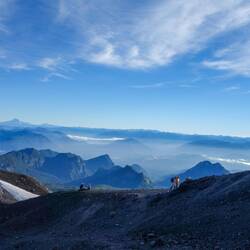Ich bin zur Zeit also recht fit und das lässt der 12-jährige Junge in mir die schöne und offensichtlich weniger fite Sue auch mehrmals wissen. Sie dankt es mir einige Minuten später, nach einer Bemerkung meinerseits, wonach meine Haut wegen dem ganzen Staub und der Sonnencreme extrem hell erscheint, mit einem nonchalanten und leicht schnoddrigen „nid wiisser als suscht“. Touchéé. Ich gebe ihr einen Kuss und wir lächeln uns an. Dann setzen wir unseren Marsch gen Gipfel in vielerlei Hinsicht geteilter Meinung fort, wobei ich ihr auf den ersten drei Schritten bereits wieder 4m abnehme und davon ziehe. Und tschüss.
