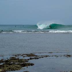 Dem aufmerksamen Leser - und Kurt - ist sicherlich bereits bildlich klar geworden, dass einem teutonischen Brocken wie mir diese erste Phase weit weniger Mühe bereitet, als den kürzeren Menschen unter uns. So bewirkt mein erstes beherztes und äusserst selbstbewusstes Einwassern denn auch eine Mischung aus Gelächter und Staunen. Mein zügiges und zielgerichtetes Marschieren und Wellenbrechen zeichnete eine eindrückliche Schneise ins Meer, wie man dies sonst nur von modernen und unkaputtbaren Containerschiffen kennt. Ich werte die Reaktionen trotz einer gewissen Verunsicherung aufgrund des Lachens - die ich mir natürlich nicht anmerken lasse - schlussendlich als Sieg. Keiner ist schneller im Wasser als ich. Yay! Es sollte aber der letzte Punkt bleiben, den ich an diesem Tag erzielen werde. Zwar erwischt man ab und zu eine der deutlich grösser als erwarteten Wellen und in einem Fall könnte man mit ein wenig Fantasie sogar von „Stehen“ sprechen, aber in den meisten Fällen wird man nach einigen Versuchen dank Strömung und Wellen samt Brett wieder an den Strand gespült. Das Lycra nicht selten bis über die Nippel hochgekrempelt und die zerkratzte und sandige Wampe wenig vorteilhaft entblösst. Trotz einigen spassigen Body- und Knee-Boarding Sequenzen, die allerdings gleich eindrucksvoll wie eben erwähnt enden, packt uns das oft gehörte Surf-Fieber noch nicht so richtig. Nachdem sich Sue dann auch noch schmerzhaft das Knie verdreht und eine neue Art des „Rückwärts-Surfens“ erfindet und ich mir den Fuss an ein paar schroffen Steinen aufschlage, legen wir die Pro-Surfer Karriere nach insgesamt vier kräftezehrenden Stunden vorerst auf Eis. Vorerst. Wir (und mein Ego) sind ja noch ein paar Tage hier.