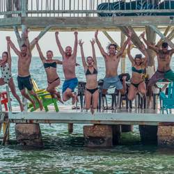 Wer denkt, das wars dann ... wir sind entweder fertig mit Fotos und können lebend gehen oder wir werden doch noch brutal missbraucht und anschliessend in Stücken im Meer versenkt, irrt. Da wir ja unsere Hostel-Buchungen für diesen Tag haben sausen lassen, sind wir allesamt herzlich eingeladen, die Nacht auf dem ersten und auch beim erneuten Betreten noch spektakulären Anwesen auf der Insel zu verbringen. Natürlich im gewohnt luxuriösen Stil mit komplettem Rundum-Sorglos-Paket und weiteren kurzen Foto-Sessions mit nächtlicher Prunk-Beleuchtung. Fuck yeah! Sechs Europäer und drei Jungs mit unklarem Background. Wir haben eine grossartige Zeit mit vielen spannenden Diskussionen und selbstverständlich erstklassiger Verpflegung. Die Jungs löchern uns mit unzähligen Fragen zum Leben, der Politik und Steuern in Europa, während ich mir meine zweitletzte Montecristo reinziehe. Irgendwann kaufe ich den Jungs dann auch die Sache mit der Mode-Kette irgendwie ab. Vielleicht doch keine Narcos. Als wir im hauseigenen und von Mangroven umgebenen Mini-Hafen beim Besteigen des Bootes, welches uns am nächsten Morgen zurück zum Casa bringt (wo unser „umgebuchtes“ Speed-Boat auf uns wartet), einen grossen Haufen Versandpakete auf dem daneben liegenden Schiff erspähen, kommen dann nochmals kleinere Zweifel auf. Vernünftig wie ich bin, entscheide ich aber, nicht nachzuhaken. Beim Casa angekommen, fällt der Abschied von Andres, Oleg und Jorge sehr herzlich aus. Offensichtlich hätten wir alle noch Lust auf weitere gemeinsame Tage gehabt. Wie man - bzw. Andres - uns aber erklärt, sei das verlängerte Weekend nun vorbei und er müsse tags darauf wieder fürs Familienimperium arbeiten. Stimmt, da waren ja noch diese komischen Pakete, welche wohl auf ihre Auslieferung warten. Die abschliessende Frage, ob wir das eine Päckchen seinem Cousin in der Schweiz mitbringen könnten, mussten wir natürlich verneinen. Ok, das war jetzt gelogen ...