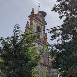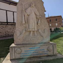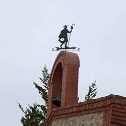 Bright blue sky and warm temps were what we got today as we left Logrono. Many were out enjoying their Sun morning in the huge reservoir park we walked through. We saw a man playing a ukulele as he walked. There were also ducks, swans & lots of cyclists. It was hot walking, low 80 degree temps. We found some shade & had a picnic w cheese, ham, and croissants compliments of the hotel breakfast buffet. On our way into town through vineyards we met a guy who had been walking from Austria with a tent, and all his gear on a cart. We passed by a bull, a fence that people have used twigs and branches to make crosses, as well as Don Jacobo winery. We could see the steeple of the village church as we entered the village of Navarette. The church bells really do ring here. The inside of the church is beautiful.Leer más