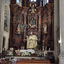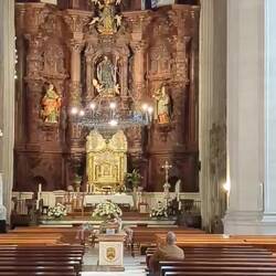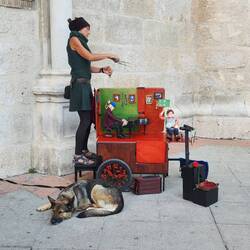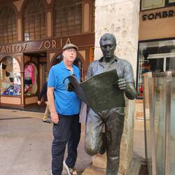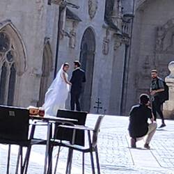 We checked into our hotel around 1:30. Couldn't believe our luck, we needed to do laundry &;found a laundromat with an outdoor cafe next to it! We had a beer in the sun as our laundry finished. We saw a bride & groom having their wedding pics taken with the Cathedral in the background. We enjoyed getting to know the old city for the rest of the the afternoon. It is crowded with soccer fans here as there is big match tonight. We took lots of pics of the Cathedral and some interesting statues.