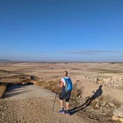 An early start today , as we needed to be out of the Albergue before 8 AM, So a 7:50 walk through the dark streets if town, past the church. And a long gradual climb to the Meseta. We have met SusanMeer informatie