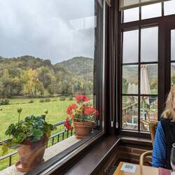 We had an hour of so of dry and misty walking, the some lighter rain until we reached the cafe here. We got under cover and a coffee break just as the downpour started.