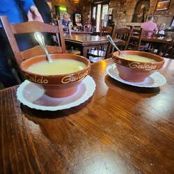 We have crossed the border into Galicia, and are have some Galician soup to warm up after a wet and chilly ascent to this mountain ridge top village!