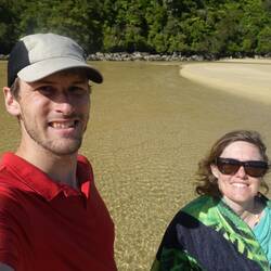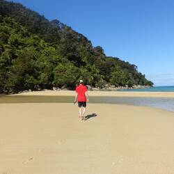 The hike was first leading along the beach before going into the jungle again. The weather was great and we came across some very clear rivers. A side trip of a few minutes led us to Cleopatras Pool, a nice natural pool within the river and a natural mossy slide. This made an excellent lunch break spot while watching others going into the cold water and use the partially painful looking slide. We still had 9km to go and continued along Torrent Bay, more jungle, and a hanging bridge above Falls River. We considered trying a swim at Medlands beach but decided to continue to our campsite at Bark Bay, set up our tent, and then try there instead. We first walked along the whole long and nice bay to have a look around and to find the best spot in terms of wind. There was a very clear river entering the sea on the other side of the bay but we eventually ended up walking into the water in front of our tent. Turned out the water was pretty shallow and it would take very long to get anywhere deep. This was probably because it was almost low tide and is probably way better at high tide. We anyways rolled a bit around in the water and then decided to try the shower we spotted on our arrival. Bad timing had it that we had to queue behind 2 other people and the shower gave up before it was our turn. However, their was still a water tap with a bit of an unreliable stream but good enough for us. You can't really expect more when being on a hike in nature.