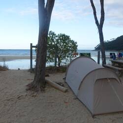 The campsite was actually located on a bit of a sandbar, in front the beach and sea, behind a lagoon that's filled at high tide. Remarkably, even here the New Zealanders were able to install water toilets and a nice kitchen area with drinkable water. A pretty cool spot to set up your tent and have dinner.もっと詳しく