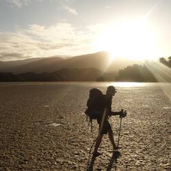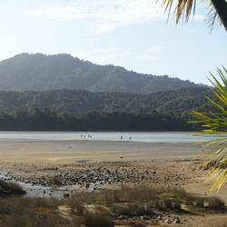 Turned out we were not the only ones being surprised by the delay and depth. Several people were waiting on our side of the river, but a couple from the other side attempted the crossing first. Someone on our side had binoculars, so we could follow their progress and it wasn't looking too good as they clearly struggled to find the shallowest path to walk. After they arrived and some others on our side started crossing as well, it was time to go. The sun was going down and after the crossing we still had to hike some kilometers and set up camp. The crossing was a combination of sticky mud with sharp shells, and now and then we had to go knee deep through a stream that tried to pull you to the right. Susanne lost her flip flops a few times, but eventually we managed to reach the other side. There we struggled to clean and dry our feet so we could put on socks and shoes again, while being under attack by sand flies. And believe us, sandfly bites are among the most itchy things you can imagine. Especially because they tend to bite your feet so every step you'll feel it. After putting on shoes eventually we walked to the campsite in one go, spoke to the other people that crossed, and went to bed.Læs mere