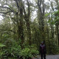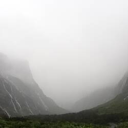 We were brave enough to get out nonetheless to take in whatever was actually visible. It wasn't too much at this point as mountains right next to us were only visible occasionally and most of the fjord just disappeared in the clouds. No sign of Mitre Peak, the mountain everyone takes pictures of usually. We didn't even see its bottom nevermind it's top. But we saw plenty of waterfalls and especially one of them was just enormous.