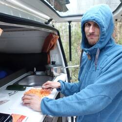 The campsite was pretty great for a free one. In a quiet forest they had plenty of camping spaces, and toilets too. The forest also had some mystic atmosphere with the clouds hanging in the trees. It was time to prepare our van bed for the first time and find out how to cook with the stuff we got. We got one of these suitcase-like gascookers. They seem more wind resistant than our hiking stove, so that was great. We found storage space for our backpacks, found decent pillows and a bed sheet. Together with our sleeping bags that made the bed. The mattress itself wasn't that amazing as it was quite thin. Also, the curtains looked like they had a bit of mold everywhere. So that wasn't that great either. Nonetheless we fell asleep early.Read more