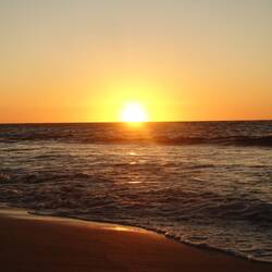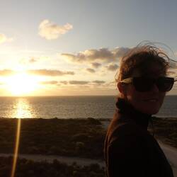 We had some time left, the weather was warm and we were in a coastal town. So it was logical to ask for the local swimming beach and give it a go. It was very refreshing but we have to add that even if you know that it's supposed to be a swimming beach it is a bit of an uncomfortable feeling if there is none else in sight. After a quick dip in the refreshing water and a shower, we headed to the perfect sunset watching spot. Yes, we are not getting tired of trying. And this time we were rewarded. Apart from a tiny cloud layer, we could watch the sun disappear in the ocean. Back at the camping the sky turned pretty orange and red which had a cool effect at the river delta. So Susanne went for another small walk before we fell into bed being quite tired.Baca lagi