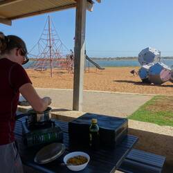 It was around 14:00 when we left and we still wanted to cook ourselves some lunch. We drove back to the coast in the town, found a great shaded lunch spot at the sea and made a lentils curry. We really enjoyed relaxing outside in the shade without too many flies bugging us. We actually enjoyed it so much that we left a bit later than we should have. We still wanted to drive 200km further to the next free camping but noticed quite quickly that we wouldn't manage within daylight. Unlike other rental company insurances we are allowed to drive in the dark despite the higher chance for wildlife collisions. So we were driving and already doubting to stop earlier when the sun was setting. When a kangoroo jumped on the road in front of us and we luckily managed to brake on time, the decision was made. We pulled into the earlier rest stop, it was already dark, so no flies, great spot and all we had to do is eat some slices of bread and go to bed.Baca lagi