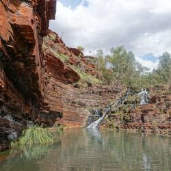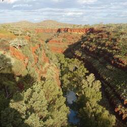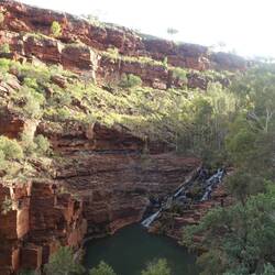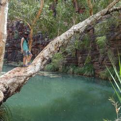 After another few hundred meters we made it to probably the most popular attraction, Nature's Window. Incredibly red, very interestingly layered rocks formed a natural window through which one could see the gorge and river below. It was really very picturesque. Nonetheless we decided to actually undertake the 8km loop track starting right behind it. First along the ridge of the gorge, later along the river banks. There are some bushes and trees for breaks in the shadow but the actual trail is almost entirely in the sun. The views of the cliffs were truly amazing and the river was actually flooded due to recent rain. Apart from seeing trees in the water that also meant we had to climb around a narrow cliff part for a few meters which added a nice challenge to the track. While still early and also windy when on the ridge, it got very warm once we were walking in the gorge. They really are not joking when they warn people to not start this track too late. So we were happy when we were back at the car park at 11:00. In the last section Machiel was a bit too tall for a tree passing, so a short break to rest was very needed.