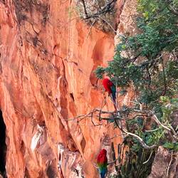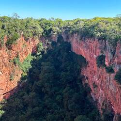 Wir starteten am Buraco das Araras. Das ist ein riesiger Sandsteinkrater, eine geologische Formation, die durch den Einsturz von Felsbrocken entstanden ist. Er hat einen Umfang von etwa 500m und eine Tiefe von 100m. Es ist die Heimat einer Vielzahl von Vögeln, insbesondere der rotgrünen Aras, daher der Name der Höhle. Dort brüten etwa 100 Paare. Unten im See fand man mehrere menschliche Skelette - sowie ein Auto. Gott weiß, wie es dahin gekommen ist. Offensichtlich ein guter Ort, um Sachen verschwinden zu lassen.