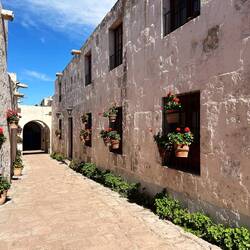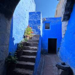 Fangen wir gleich mal mit dem Highlight an: Das Kloster Sta. Catalina. Hammer! Wunderschön. Ehemals von maximal 250 Nonnen bewohnt, leben heute noch 20 hier, daher sind nicht alle Bereiche zugänglich, aber bei einer Gesamtfläche von 20.400 Quadratmetern fällt das nicht auf. Der ganze Komplex ist mit einer hohen und dicken Mauer von der restlichen Altstadt abgetrennt und aus Sillar, dem weissen Vulkangestein erbaut. Dieser wird nur ein paar Kilometer von Arequipa entfernt abgebaut. Widerstandsfähig, leicht porös und gar nicht sooo leicht. Ein Säulenstein wiegt 50kg. Zusammen mit einer Eiweißmörtelmischung und der Bauweise hat sich das Ganze als relativ erdbebensicher erwiesen. Die Stadt liegt zwischen 3 Vulkanen, da ist das ganz hilfreich. Laut Guide gibt es jeden Tag im Schnitt 4 kleine Erschütterungen, das letzte grosse Erdbeben ist aber schon über 20 Jahre her, Juni 2001 mit der Stärke 8.3. Nachdem das Gestein also weiss ist, blendet es in der Sonne stark, was zu Augenschäden führt, daher wurden viel Außenwände im Kloster rot und blau angemalt. Die Luft hier ist extrem trocken (man merkt es in Augen, Nase und Hals). Die Farbschichten zerfallen daher alle paar Jahre zu Staub und müssen erneuert werden. Für mich war das indigo-blau natürlich toll!! 😍