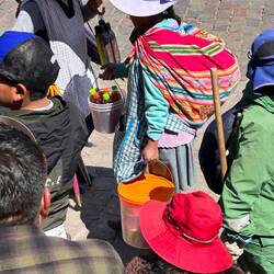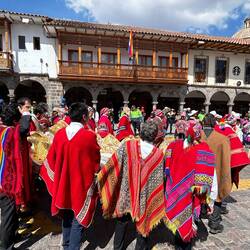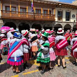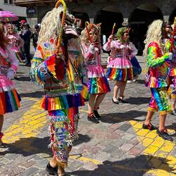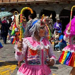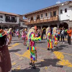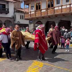 June 7 - Corpus Christi in Cusco. That means dances and processions all day long. But these processions are not rigid. I think the saints will be super happy when they can go back to their churches for a few months after all that shaking on the streets. The street vendors sense their chance, they are offering umbrellas, sombreros, popcorn, ice cream, drinks, children's toys, cards with the names of the saints and what they have accomplished, churros, empanadas, pieces of melon, and and and. The flag of Cusco flies above everything, which makes the streets wonderfully colourful. Not to be confused with the Gay Flag (which doesn't have the light blue). 80% of the inhabitants here are Catholic, the Spaniards were thorough (after all, only 1 million of the 12 million inhabitants of the Inca Empire survived the conquest). Today there is still exactly one tribe, apart, who still have 100% pure Native Inca blood. If I remember correctly, that is 2,500 people who are also not allowed to marry "outside". Otherwise they will be banished from the village. The residents come to Cusco once a year to exchange goods and lay hands on them. All other Peruvians are mixed race (own statement of a Peruvian). However, some have accepted the Catholic religion in addition to their pagan beliefs, as can be seen from the cross with the two bulls on the roof.Read more