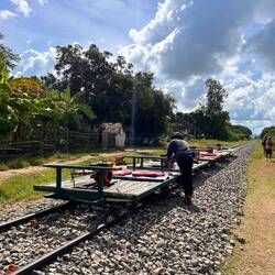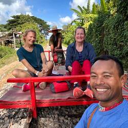 Battambang is located almost 300 km northwest of Phnom Penh. The Thais liked to have a go here, as it is also close to the border. With 1 million inhabitants, it is actually the second largest city in Cambodia. It is located on Tonle Sap Lake - we had already seen the river in Phnom Penh, which flows into the Mekong. Battambang is THE rice chamber (or as they say here: the rice bowl) of the country. Battambang rice is famous and popular and is enough to supply the whole of Cambodia, rice does not need to be imported. Maybe this is due to a certain spicy ingredient, but more on that later. In any case, the area is perfect for rice cultivation, as flat as a sandwich and beautifully underwater. Rice is only grown here twice a year. You can see the families working in the fields. We tourists make ourselves more comfortable and take a ride on the Bamboo Train. At that time he brought goods to the border to Thailand. Today you drive rattling straight ahead for 10 minutes. Always hoping that a white cow won't suddenly appear on the tracks. At the end, the vehicle is lifted off the tracks using muscle power and turned back in the other direction. Then it goes back. I think the whole village lives from the campaign. In Battambang itself you drive past the black king Dambang Kranhoung. According to a Khmer legend, he is said to have thrown his wooden staff from Angkor, which then landed here (3 hours' drive away). Good thrower, I would think! Battambang means something like “lost staff”. Maybe it should be called “rediscovered staff”.Read more