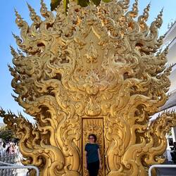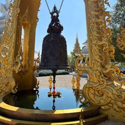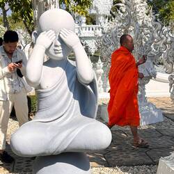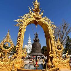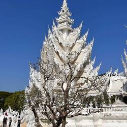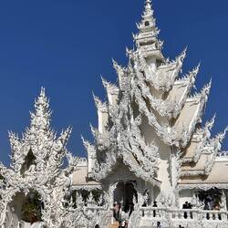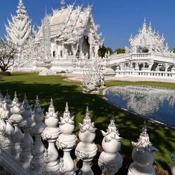 Wiki: Wat Rong Khun ist ein privates Kunstwerk im Stile einer buddhistischen Tempelanlage. Der Bau begann 1997 und ist noch nicht fertiggestellt. Die Primärstruktur des Tempels besteht aus einem Betonrahmen und einem Holzdach. Und während es aus der Ferne so aussieht, als wäre es aus funkelndem Porzellan gefertigt, wird bei genauerem Hinsehen deutlich, dass der schillernde Effekt durch eine Mischung aus weißer Farbe und transparenten Spiegelsplittern erzielt wird.