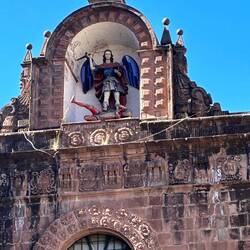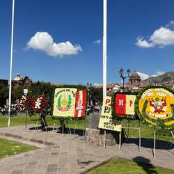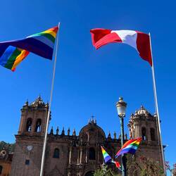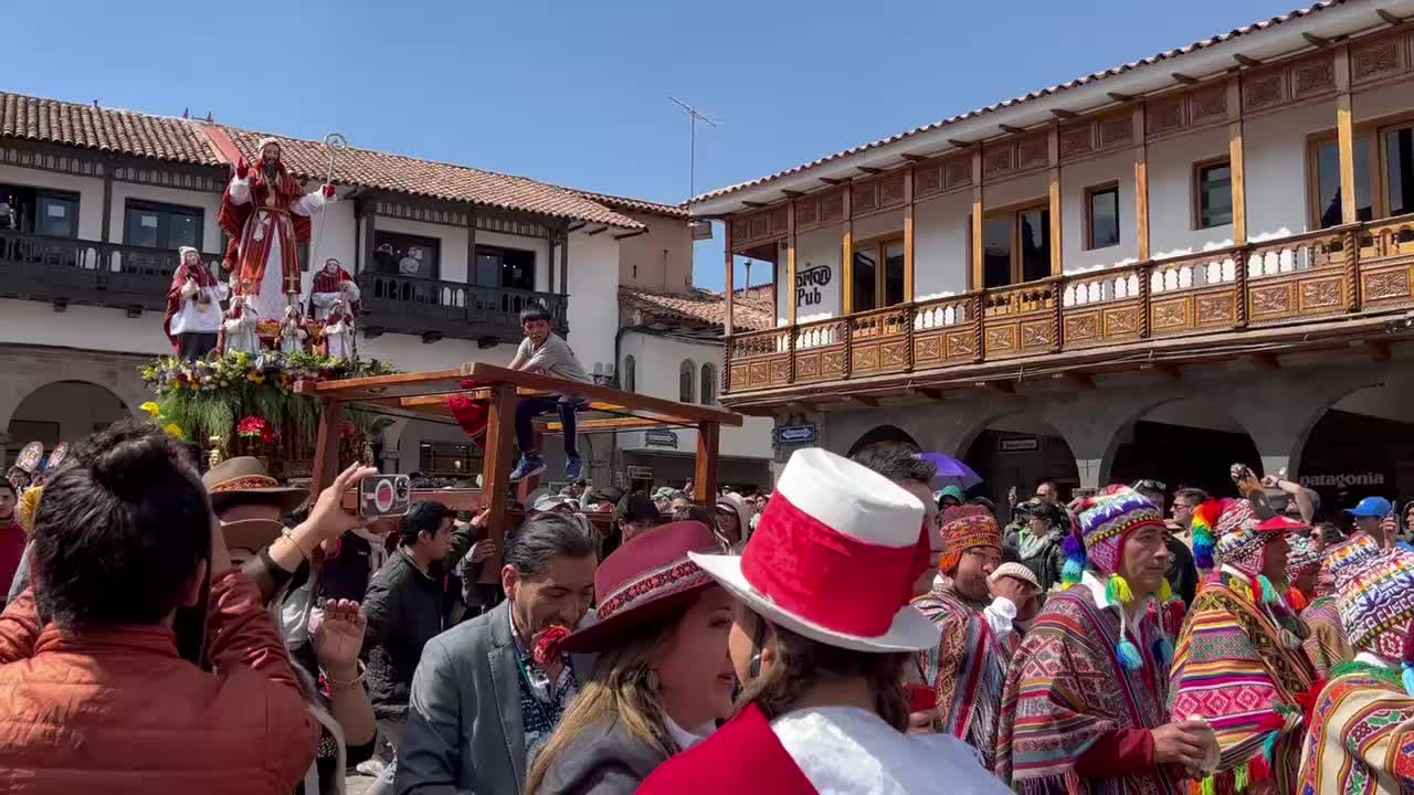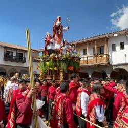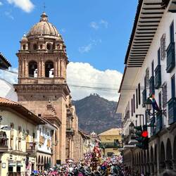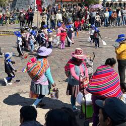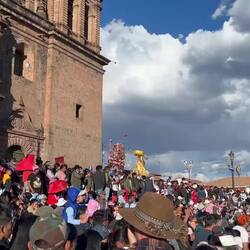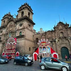 June 7 - Corpus Christi in Cusco. That means dances and processions all day long. But these processions are not rigid. I think the saints will be super happy when they can go back to their churches for a few months after all that shaking on the streets. The street vendors sense their chance, they are offering umbrellas, sombreros, popcorn, ice cream, drinks, children's toys, cards with the names of the saints and what they have accomplished, churros, empanadas, pieces of melon, and and and. The flag of Cusco flies above everything, which makes the streets wonderfully colourful. Not to be confused with the Gay Flag (which doesn't have the light blue). 80% of the inhabitants here are Catholic, the Spaniards were thorough (after all, only 1 million of the 12 million inhabitants of the Inca Empire survived the conquest). Today there is still exactly one tribe, apart, who still have 100% pure Native Inca blood. If I remember correctly, that is 2,500 people who are also not allowed to marry "outside". Otherwise they will be banished from the village. The residents come to Cusco once a year to exchange goods and lay hands on them. All other Peruvians are mixed race (own statement of a Peruvian). However, some have accepted the Catholic religion in addition to their pagan beliefs, as can be seen from the cross with the two bulls on the roof.Baca lagi
