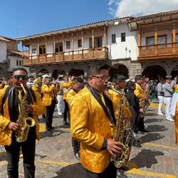 7.6. - Corpus Christi in Cusco. Das bedeutet den ganzen Tag Tänze und Prozessionen. Aber steif sind diese Umzüge nicht. Ich glaube, die Heiligen sind heilfroh (ha ha), wenn sie nach dem ganzen Durchgeschüttle auf der Strasse wieder für ein paar Monate in ihre Kirchen zurückkönnen. Die Strassenhändler wittern ihre Chance, es gibt Sonnenschirme, Sombreros, Popcorn, Eis, Getränke, Kinderspielzeug, Karten mit den Heiligennamen und was sie vollbracht haben, Churros, Empanadas, Melonenstücke, und und und. Über allem weht die Fahne Cuscos, das macht die Strassen herrlich bunt. Nicht verwechseln mit der Gay Flag (die hat kein hellblau). 80% der Einwohner hier sind katholisch, die Spanier waren gründlich (es haben ja von 12 Mio. Bewohnern des Inkareiches auch nur 1 Mio. die Eroberung überlebt). Heute gibt es noch genau einen Stamm, abgesondert, die noch 100% reines Ureinwohnerblut haben. Das sind, wenn ich mich recht erinnere, 2.500 Personen, die auch nicht „nach draussen“ heiraten dürfen. Sonst werden sie sus dem Dorf verbannt. Die Bewohner kommen 1x im Jahr nach Cusco, zum Warentausch und Hsndauflegen. Alle anderen Peruaner sind Mischlinge (eigene Aussage eines Peruaners). Manche haben aber die katholische Religion zusätzlich zu ihrem heidnischen Glauben angenommen, das sieht man an den Kreuz mit den zwei Stieren am Dach.
