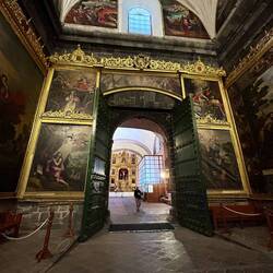 Man darf hier keine Fotos machen, alle Bilder sind somit illegal. Aber es ist zu schön: Die Kathedrale geht links und rechts direkt in zwei andere Kirchen über. Man geht quasi quer durch alle von rechts nach links durch. Natürlich stehen alle drei auf ehemaligen Inka-Tempeln. In der Kathedrale selbst ist alles zugebaut, in jede Nische eine Kapelle oder ein Altar reingebaut. Ein paar Besonderheiten fallen auf: Das letzte Abendmahl…. Abendmahl mit Meerschweinchen: Der peruanische Maler Marcos Zapata (um 1710-1773) stammte aus dem indigenen Volk der Quechua. Für die Kathedrale von Cusco malte er Jesus und seine Jünger mit der Speise, die in dem südamerikanischen Land als Delikatesse für Festmähler gilt. 🤣