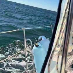 Later in the day the ocean waters became more turbulent causing the boat to both roll side to side and pitch up and down. As luck would have it I made a mistake with the toilet head that caused the motor to burn out. 😳It was bucket time for me. Luckily my time backpacking in the wilderness prepared me for this inconvenience. That night when I went down below to sleep before my night shift the bed was at an impossible angle from healing to be able to sleep. Thankfully after 30 minutes or so Kevin reefed the mainsail more to level the boat some. We were about 13 miles off shore and unfortunately the motion caused Kevin to get a bit seasick. By 2:00 a.m. Friday morning a fourth sailboat had joined us, Harvest Moon.