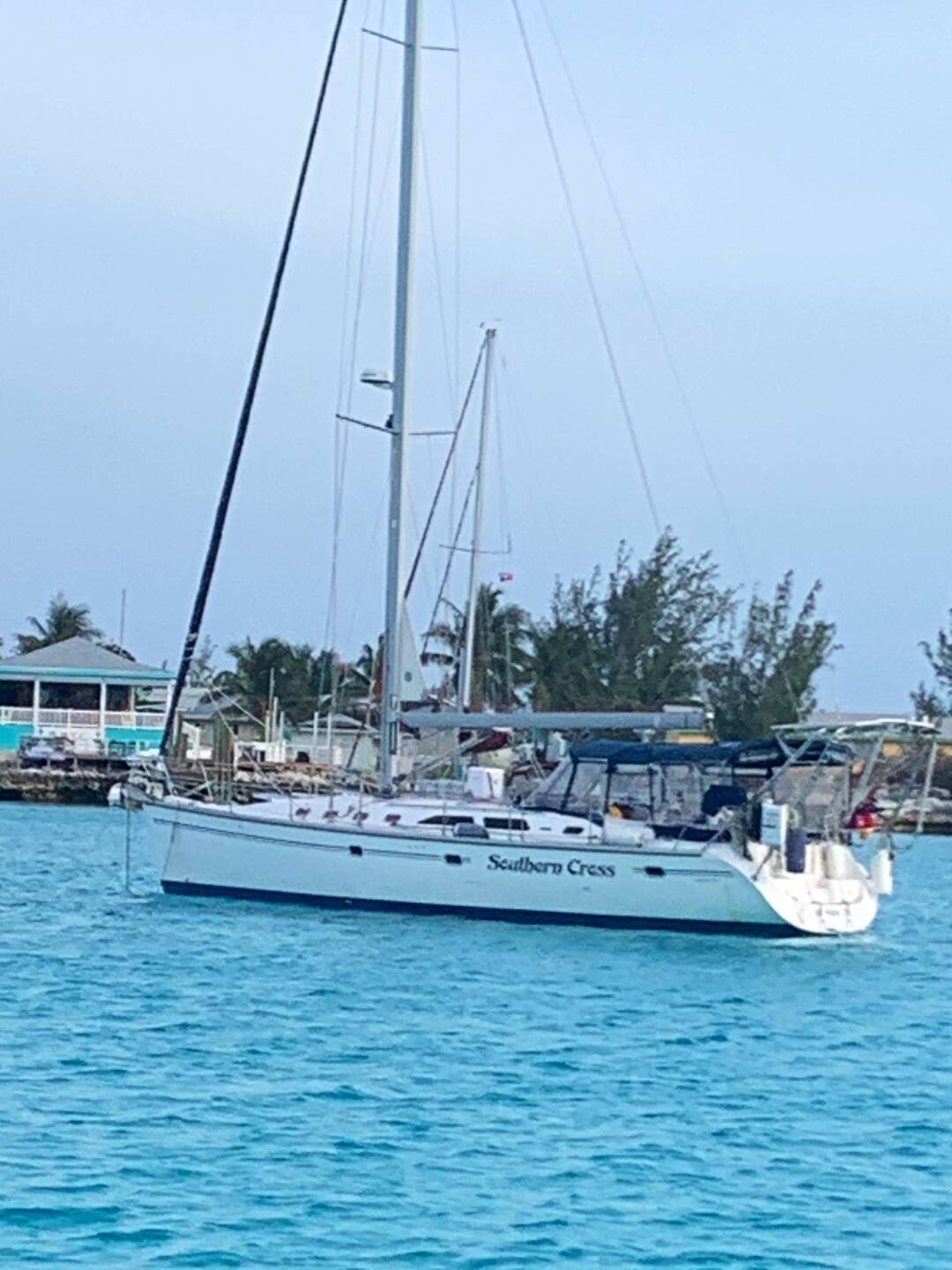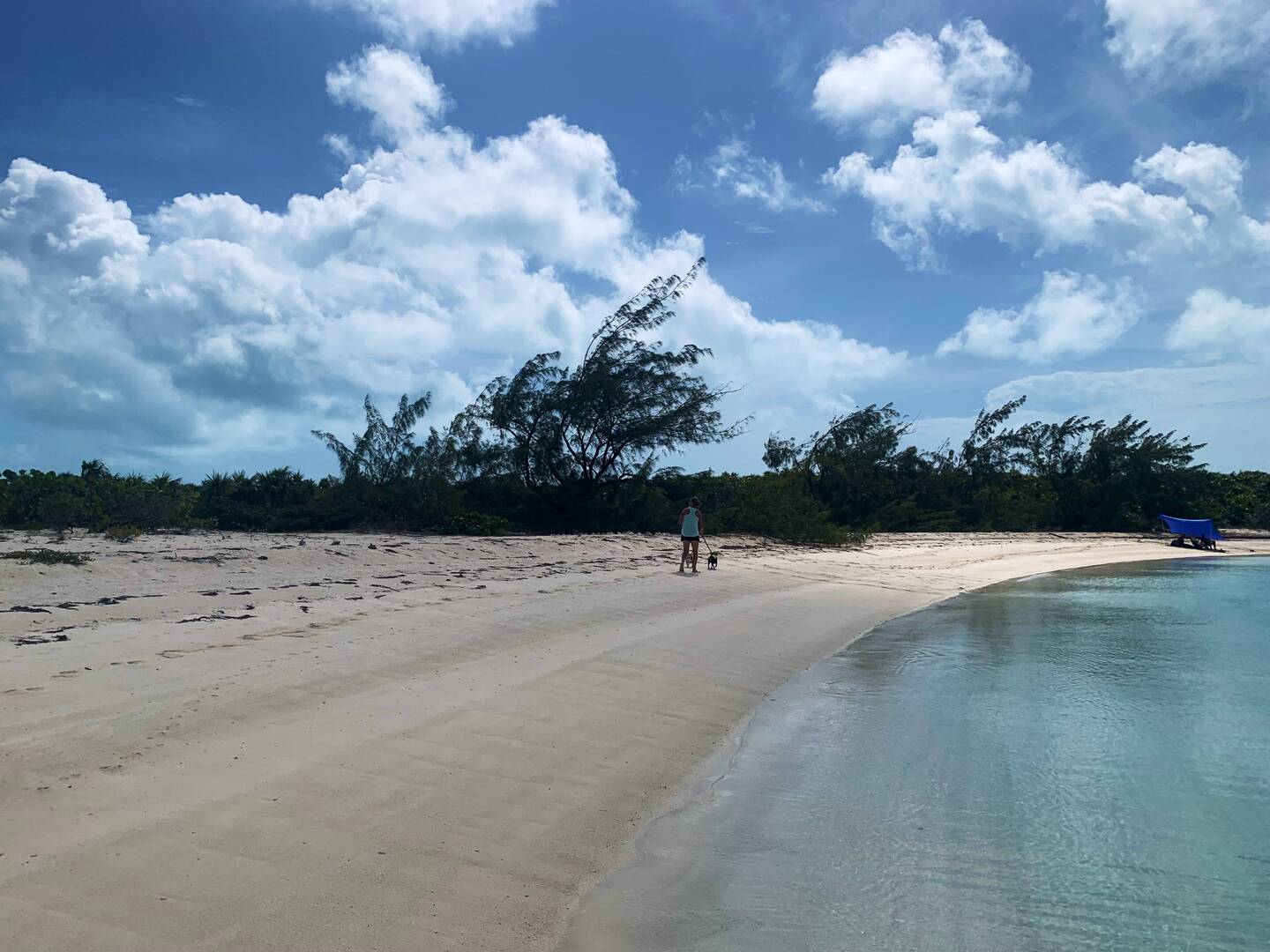 We left Pipe Cay for Cambridge Cay the next day around 9:30 a.m .and pulled out the genoa at 10 a.m. Nice day for a sail, winds were from the southeast starting out at about 10 knots and picked up to 20 knots as we got further out in the bank. We were able to get a mooring ball at Cambridge Cay, which is first come, first serve. This was our second time on a mooring ball and we had much better success grabbing it with the boat hook than we did the first time! The tide, surge and winds were calmer for one, Kevin approached it at an angle and speed that allowed me to grab the rope close to the hook where I could bring it up to the boat. After securing the ball we lowered the dinghy and took the dogs to the beach. As we were getting back into the dinghy I felt something wrap around my foot and thought it was prickly seaweed. Then Kevin saw a small crab scurrying away, apparently I got a little to close for comfort and it let me know! Later that day as we were sitting in the cockpit we watched this large charter motor yacht (the Below Deck kind) making its way into the mooring field and motor between our boat and another boat very close. I commented that it was a whale of a boat. I forget the make of the boat but it began with a W so I named it Wally the Whale!