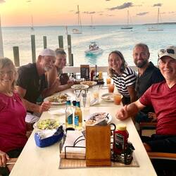 Saturday, March 2 - We went for a long walk on the island with the dogs looking for a produce stand and a liquor store but didn’t find either. Then went to Deshmon’s for pizza. There were several Bahamians hanging around outside all drinking beer. It was 11:30 and Kevin made a joke about about beer for breakfast and one replied it was lunch! Kevin walks inside and the only woman outside asked if we needed help. When ordering the pizza we were told it would take an hour as she would need to make the dough; so we placed our order then took the dogs back to the boat. Once back at Deshmon’s Lisa and Ellis walked in and we had lunch with them. That evening we went to Karl and Conner’s boat for a glass of wine. For dinner we went to Lorraine’s for the BBQ buffet and met a nice couple from Massachusetts. They gave us lots of suggestions for where to sail in New England and Maine. They asked if we had a heater on board and out response was only at a marina, they said have blankets ready! 😳 When the fog comes in it gets cold, even in August. Karl and Connor said the boat stays cool because the water is so cold. I may need to retrieve warmer clothes when we go home to get our stuff from storage!Leia mais