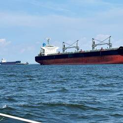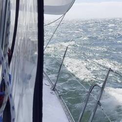 When my shift started at midnight (now Tuesday) we were approaching Virginia Beach and the wind, water and temperature were all mild. We had been motor-sailing at 5.5 knots until about 1:00 a.m. Suddenly, the wind picked up and we went from a speed of 5.5 knots to 7 knots. I depowered the genoa but we continued to gain speed. I slowed the boat down and we continued to gain speed. I shut the motor off, let the genoa out more but we still picked up speed and were going 8 knots, heeling more than I cared to, with winds at 37 knots. At 1:30 a.m. I woke Kevin up trying to keep my voice calm! Over the next 2 hours we continued to depower the sails and reef them in. It’s difficult when the wind is strong. By 4:00 a.m. we had pulled the Genoa in completely and the mainsail was reefed to about 1/4 of the way out. I made coffee because neither of us was going to get any more sleep at that time. By 5:00 a.m. Tuesday we were entering the Chesapeake Bay.