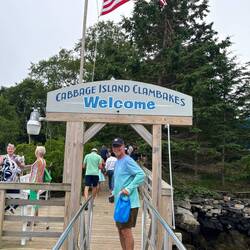 Wednesday, July 10 - We strolled around the town of Boothbay by the wharf with Gary and Renee and did some souvenir shopping, it’s a cute town with pretty views of the water and lots of summer flowers. Later in the afternoon we all went to the Cabbage Island Clambake. A tour boat took us around the harbor and islands and the captain talked about the history of each island. On Cabbage Islsnd we were served a meal of chowder, 2 lobsters, a dozen clams, potato, corn on the cob and an onion and egg! It was a fun excursion.