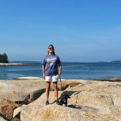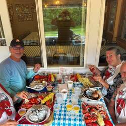 Wednesday, July 17 - We left at 8:30 in the morning to catch the 9:15 Island Explorer Shuttle in town to go to Bar Harbor. We decided it was easier to do that than move the boat and anchor in Bar Harbor as it was a 35 minute free shuttle ride. We walked around Bar Harbor going into several of the shops and had lunch at The Thirsty Whale, recommended by one of the shop owners. The town was more touristy than I expected, most of the shops were high end souvenirs, local sourced maple syrups, jams, etc. There was a very expensive sporting goods store, a few clothing stores and restaurants/bars along every street. That night Brian, who had a boat at Watergate Marina, picked us up at the dock and drove us to his house for a wonderful lobster boil.
