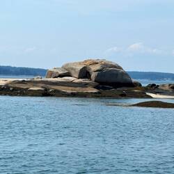 Saturday, July 20 - We originally had planned to go to Bar Harbor then head back west. However, Gary and Renee wanted to touch Canadian waters and since it was only a few more miles east we decided to go with them. We left Somes Sound in Mt. Desert Island at 8:30 a.m. with a clear sky, smooth water and warm air. Once in the Gulf of Maine the winds were light at less than 10 knots. We were on a starboard beam reach and able to use both main and jib to help us along at 5 knots with the motor. Water temperature was 61 degrees which makes the air colder especially in the cockpit where there is little sun. Before long we were in jackets and Pepper was in her sweater. I spent time on deck in the sun where it was much warmer and helped look for submerged lobster pot bouys. We anchored at Slate Island at 3:30. Only 3 boats were there; us, En El Viendo and one other sailboat closer to shore on a mooring.