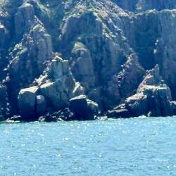 Monday, July 22 - Last night we went over to Gary and Renee’s boat and agreed to head straight to Canadian waters rather than the original plan of stopping at Mink Island for a night. Weather forecast was rain Tuesday through Thursday and Renee and I both thought it would be better to make a long one day journey in nice weather rather than risk moving in rain or having to wait it out before going. We awoke at 6 a.m. and left by 7 a.m. The air temperature was below 60 degrees when we woke up and the water temperature was down to 53 degrees. At 9:30 a.m. our course heading was 100 degrees east, water depth was 300 feet one half mile from shore and winds were 8 knots. And it was cold. A cute seal popped its head out of the water and looked first at our boat then turned and looked at En El Viendo next to us. At 10:30 a.m. we were in Canadian water. We sailed another 60 minutes to the island of Grand Manan, Canada and went to the rock formation called Southern Cross to take pictures. On returning the wind was against us at 20 knots, coming off our port side bow. We pulled out the jib and motor-sailed at 5 knots, and later on we were up to 7 knots when we turned to the north a little. With the wind against us it was much colder and we were heeling about 18 degrees, this made for an uncomfortable ride as there were so many lobster pots to watch out for and i was hunched down looking under the jib or sticking my head out the window all with a cold blast of air in my face looking for the next pot. Finally at 2:00 we reefed the main then pulled in the jib and the ride smoothed out. We anchored in Northeast Harbor of Cross Island, National Wildlife Refuge at 2:36 p.m.Leia mais