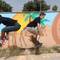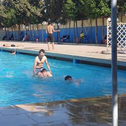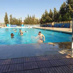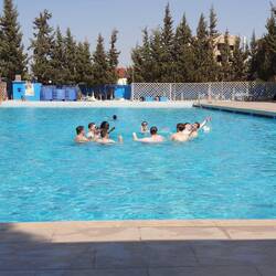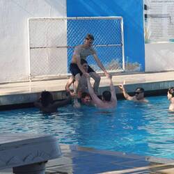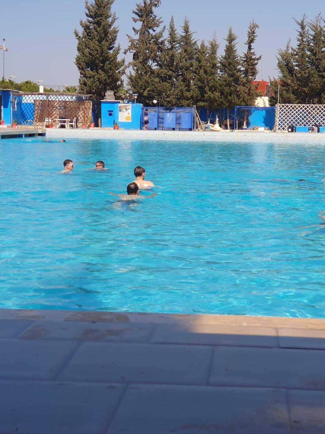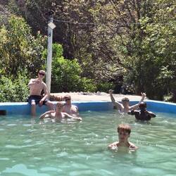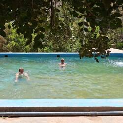 In de bergen is het ook warm en even zwemmen in de plaatselijke piscine doet wonderen, alleen best niet onder water, je weet maar nooit... Daarna wat spelen met de plaatselijke kindjes, enkele jongensLæs mere
