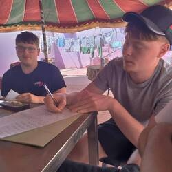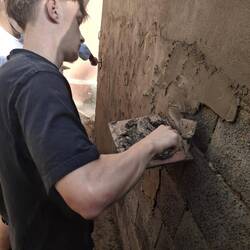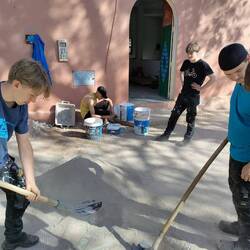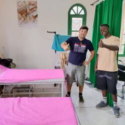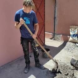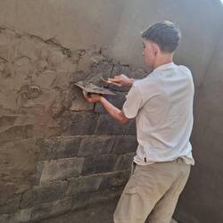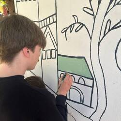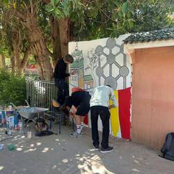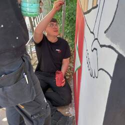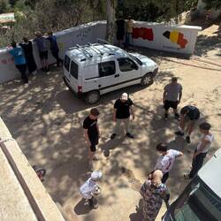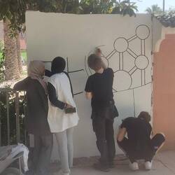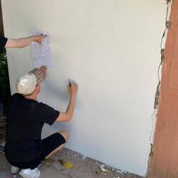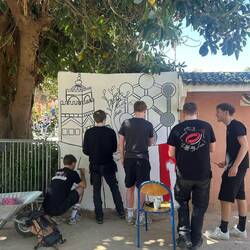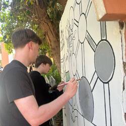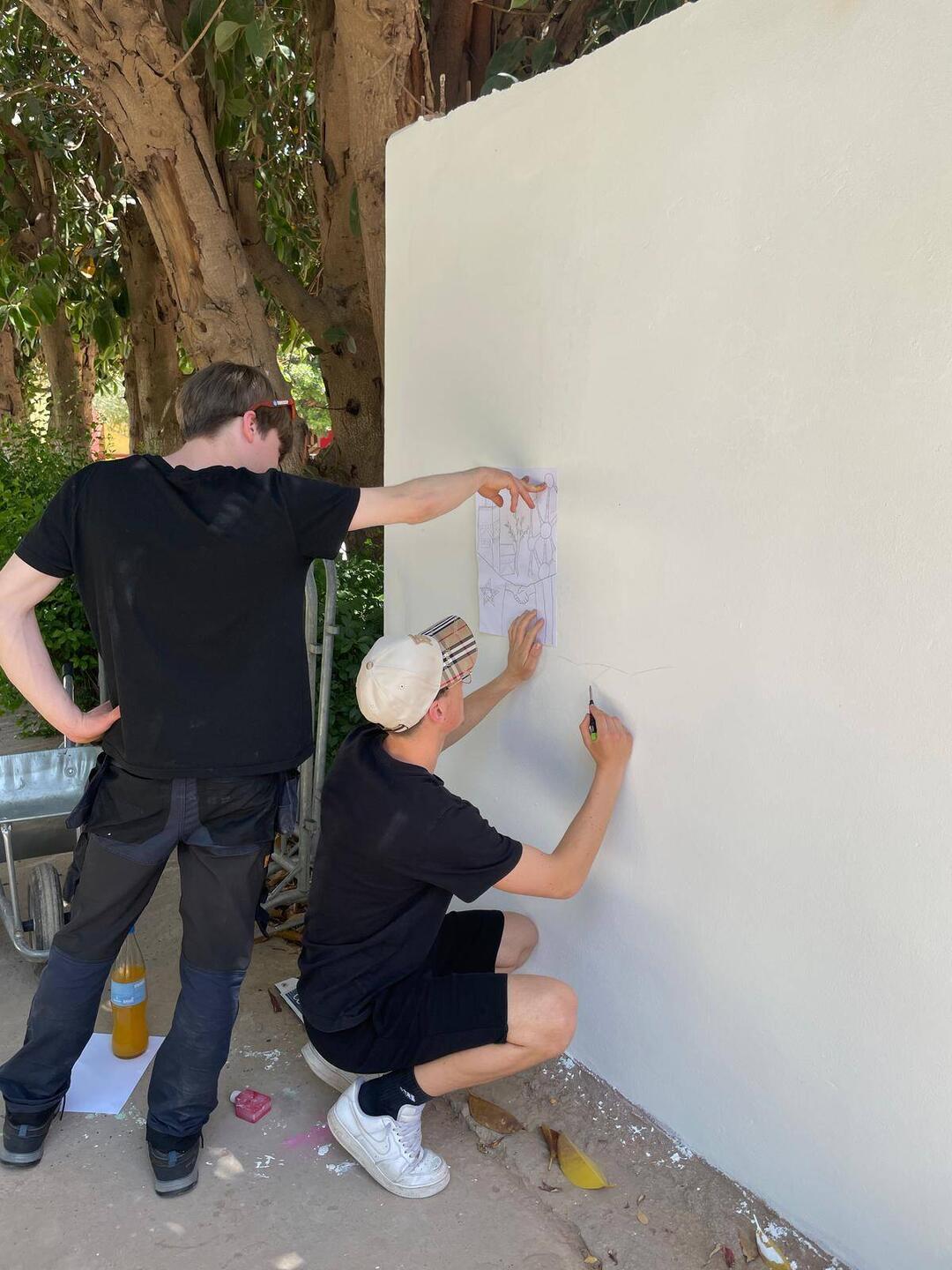 Michael, Seppe en Iann gingen deze middag aan de slag met het ontwerp voor de muurschildering: eerst werd de muur gewit, daarna voorzien van de tekening... morgen aan de slag met het schilderwerk.Læs mere