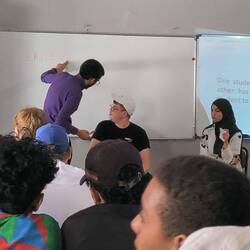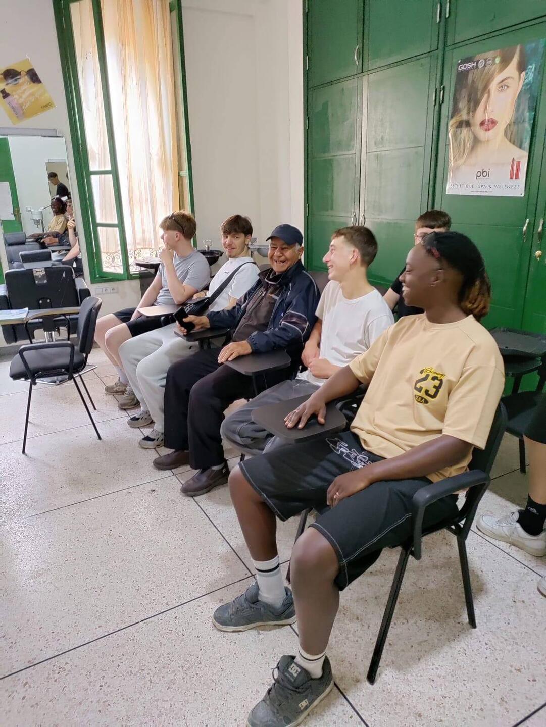Deze middag trokken we terug naar het Lycée, maar eerst stelden we wat vragen op voor een gezamenlijke les Engels. Onze artiesten gingen ondertussen verder met hun ontwerp, ze kregen spontaan de hulpLæs mere