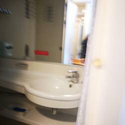 Punkt 16:30 konnten wir einchecken. Unsere Kabine ist ganz zuvorderst in der Mitte. Ganz cool der Ausblick von da 😎