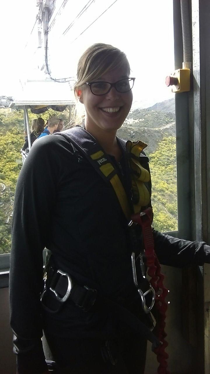Elle aurait bien le droit d'être les deux! Mademoiselle s'aprete à sauter 134 mètres de hauteur tout ça accroché par les chevilles d'une nacelle entre les deux plus hautes montagne de Queenstown!