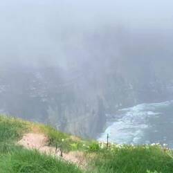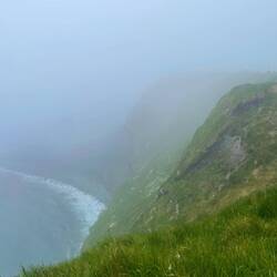 Die Sicht ist ziemlich eingeschränkt, aber zwischen den Wolken waren die Klippen immer mal wieder sichtbar. Es ist sehr sehr windig und die Aussicht wechselt minütlich.