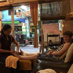 The next day we were all keen to see the Grand Palace so once again we jumped on the river boat and had a short trip to the Palace. Even though we arrived well before 10am, it was so hot and crowded that we were all a bit over it by the time we even bought our tickets. The price of the tickets blew out our daily budget as well and in retrospect we wished we had just enjoyed walking around the beautiful outer buildings and gardens without going right into the center piece. Once inside the inner sanctum of the Palace walls it was so full, we could barely walk around and could not enjoy it fully in the heat so we dropped off the back of our (free English speaking) tour and found the nearest exit. We did manage to see the Emerald Buddha and some other beautiful and elaborate structures while we were there but decided at that moment not to visit any of the other tourist sites during the rest of our stay but rather take in the atmosphere of our beautiful neighbourhood and amazing local restaurants so we jumped in a tuk tuk and headed back to Soi Samsen 8. Jacob and I went for a foot massage which I loved, Jacob not so much as he was so ticklish and made his masseur giggle the whole time.