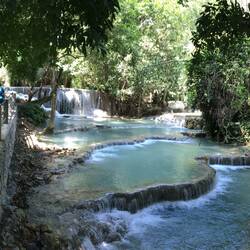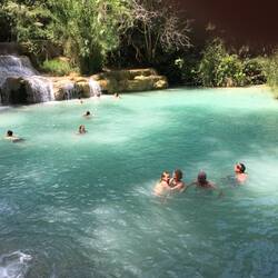 During our days we packed in as many activities exploring the wonderland as we had time for in a week. We spent a day cruising up the river in a long boat, taking in the river life of the locals, stopping at sacred caves, eating another best lunch ever and watching local weavers making scarves and rugs. The next day we went out to the Kuang Si waterfall to swim in clear, cool torquise water in the natural and beautiful terraced pools below the falls. As we walked up to the falls we passed through Free the Bears Sanctuary where they provide a safe home and rehabilitation for the Moon bears that are rescued from poachers who capture the bears in order to extract their bile for medicine. Our lunch this day was truly at the most beautiful restaurant we had ever been, sitting on a deck in a tropical garden with the waterfalls flowing underneath and all around us. We tried frogs legs for the first time but were not keen, will stick to the traditional Laos cuisine for now on. There is a lot of French cuisine here as Laos was colonized by the French and there are still beautiful bakeries and pasteries everywhere we go.