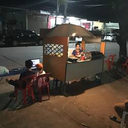 The daily routine was very casual but there was usually time between 9.30-11.30am to learn some new vocabulary using fun games learning apps like Kahoot and Quiz lit, or to work on the garden development project or tourism projects they had going. This was followed by a big communal lunch session between 11.30-1.30 where everyone helped to prepare the daily lunch banquets of amazingly varied and delicious local dishes from both Laos and Isaan. The meals were always a delicious perfectly balanced combination of spicy, sweet, acid and salty flavors and it was really nice to cook together and chat, have a laugh and learn some new techniques in the very basic but efficient kitchen. Every meal was centered around a huge basket of sticky rice which we have not been able to find in other parts of Asia and we now crave every day. The sticky rice is grown and supplied by TT’s family and it is the staple food for Isaan people, where the farmers work long and hard and rely on the slow releasing energy in the sticky rice to keep them going all day. These routine lunch banquets where a highlight of our day, after which we would cycle down a few blocks to our favourite iced coffee cart to sit in from of the fan and order our regular yen cafe and na manaw. That’s iced coffee for us and fresh lemonade for the kids. From 1.30-3pm there was another learning session where we would help the students work on their projects. The afternoons were so hot and we were always lazy after the feast so not so much was achieved during this time. 3pm was Mala time. The students run a BBQ cart outside OPM and all money raised from the BBQ was used to supply all the food for the center. Chloe loved this time of the day when she could help Ty prepare and sell the food. Olivia always helped at the DJ station they had set up and Jacob was the best BBQ customer. It was a fun time where they had the music pumping on the street, delicious food cooking and a special Sichuan spice rub that we are also now addicted to.