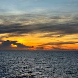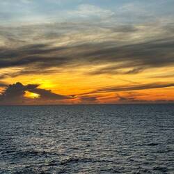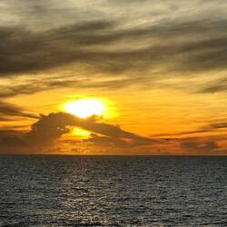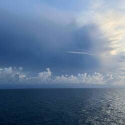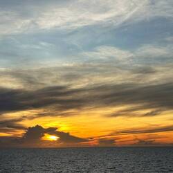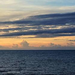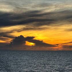 We are sailing in Arafura Sea. At about 6:10 AM this morning from deck seven off of Neptune’s stern the clouds painted the skies with all sorts of shapes, textures, and sizes. The morning sunrise colors on the horizon were calm not overly brilliant giving me a peaceful reminder to slow down and breathe. Turing around towards the east - high in the dark blue sky a full moon guides our captain towards our next destination. Much to the surprise of all of us this morning we enjoyed the mountain vistas of Donut Island. Please enjoy these morning images.