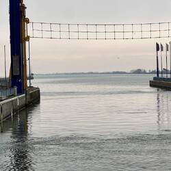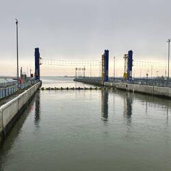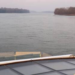 Something about seeing a bright red light stopping a ship our size always makes me smile. Red means wait — even on the Danube. And so we did. Once the water level inside matched the outside and the massive gates dropped low enough to clear the draft of the Rinda, the light shifted to green, giving us permission to continue.