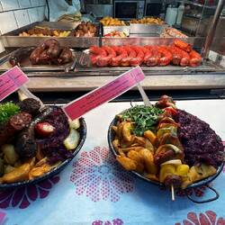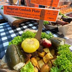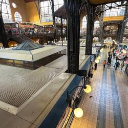 Inside the market, the scene hit us all at once—a visual overload of color, smells, and energy. Downstairs, food vendors filled every inch with fresh vegetables, meats, spices, and ready-to-eat Hungarian dishes. I found myself staring at the mountain of produce thinking, How do they go through all this food?