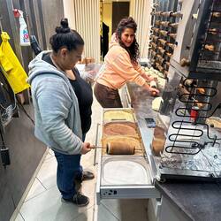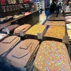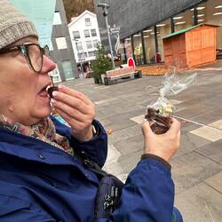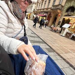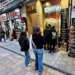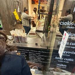We eventually tracked down a Chimney Cake shop, something we’ve wanted to try since arriving. Two ladies inside were having way too much fun making them—laughing, rolling dough, roasting the spirals over open heat. Their joy alone was the price of admission.