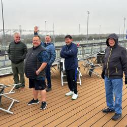 A few fellow Rinda travelers were already on the top deck when I came up — bundled in jackets, coffees in hand, all of us braving the cold morning air. Inside the huge concrete chamber, the ship began to rise, slowly lifting us above the shoreline like an elevator made of river water.