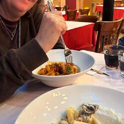 From the vineyard, we walked the quiet path back into Vaduz, watching the light settle behind the mountains. Our hope was to return to Adler Vaduz for a second dinner, but the restaurant side had already closed for the night. The staff kindly sent us to a nearby Italian spot — one that we’re pretty sure Walter owns as well. It was simple, comforting: pastas, a bit of wine, and two travelers who had already walked a full day.