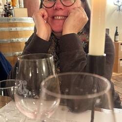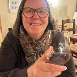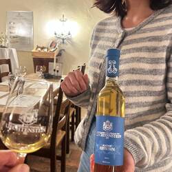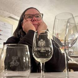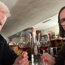 Traveling off-season turned out to be our secret superpower. We arrived a little before our 3:00 PM tasting and spent a while wandering the grounds — rows of vines, mountains painted with a dusting of snow, and the kind of deep alpine silence you can feel in your chest. Inside, a young woman welcomed us and led what ended up being a private tasting, just the two of us. She walked us through the winemaking process, the history of the estate, and then poured a lineup of whites, reds, and even a very lovely ice wine. Donna and I looked at each other with the same expression: Yep… that one’s good.